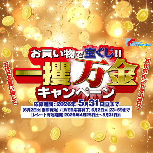 専用応募はがき、または郵便はがきに氏名(フリガナ)・郵便番号・住所・TEL・性別(任意)・年齢・ご購入万代店舗名・ご希望の賞品いずれか1つ『ポイントコース【3,000円コース】50,000ポイント 【1,000円コース】10,000ポイント・一攫万金コース ・選べるギフトコース』を明記のうえ、対象商品500円(税抜き)以上を含む、合計金額1,000円(税抜き)以上もしくは対象商品500円(税抜き)以上を含む、合計金額3,000円(税抜き)以上のご購入いただいたレシートを貼って応募宛先までご応募ください。