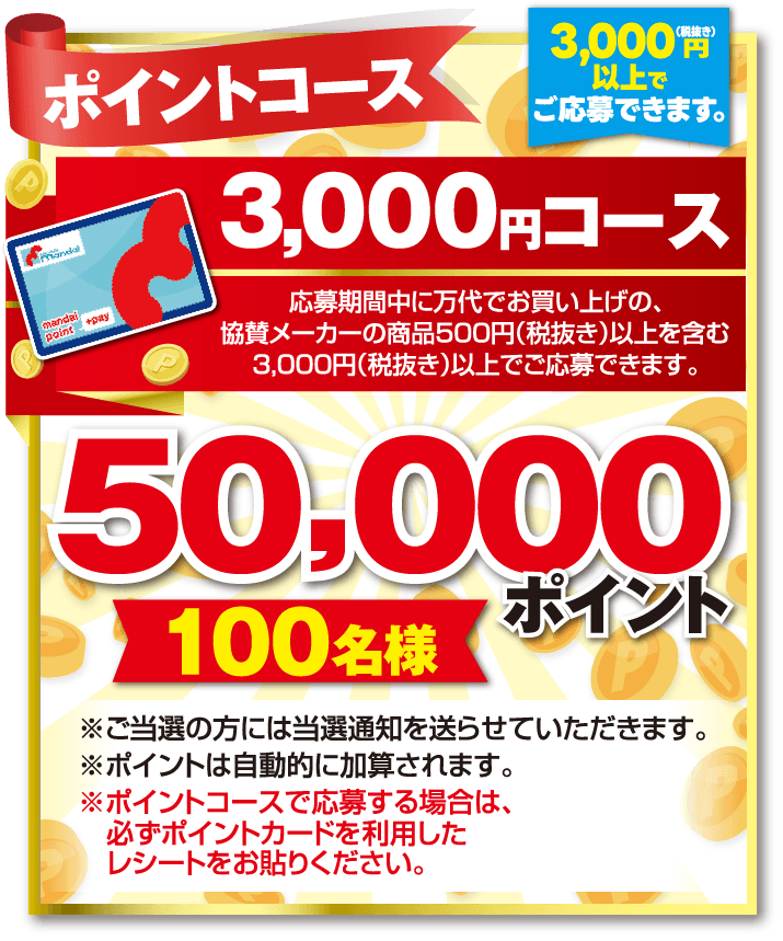 【1,000円コース(税抜き)】対象商品500円(税抜き)以上を含む、合計金額1,000円(税抜き)以上のレシートで応募!【3,000円コース(税抜き)】対象商品500円(税抜き)以上を含む、合計金額3,000円(税抜き)以上のレシートで応募!